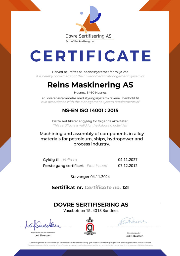 Våre styringssystemer for kvalitet og miljø er ISO 9001:2015 og ISO 14001:2015 sertifisert. Dette fører til et vedvarende fokus på kvalitet og miljø, gjennom alle ledd i produksjonsprosessen og god sikkerhet for våre kunder.